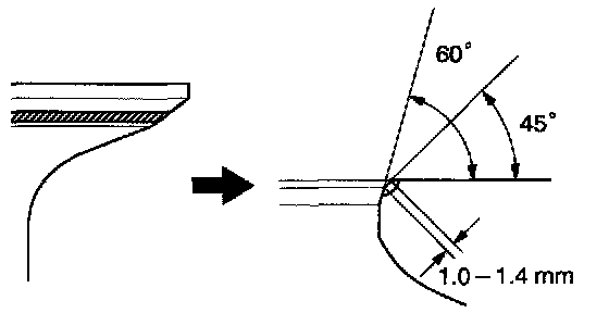 - Check that the seat contact is in the middle of the valve face with the following width: 1.0 - 1.4 mm (0.039 - 0.055 inch)