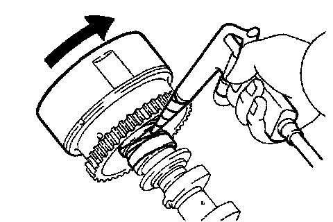 e. Under the condition of (d), turn the VVT timing sprocket to the advance angel side (the arrow marked direction in the illustration) with your hand.