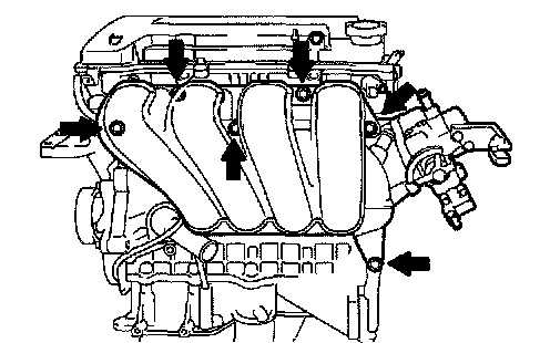 c. Remove the 4 bolts, 2 nuts, 2 wire brackets, the intake manifold and throttle body assembly.