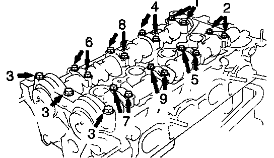 Uniformly loosen and remove the 19 bearing cap bolts in several passes, in the sequence shown, and remove the 9 bearing caps, intake and exhaust camshafts.