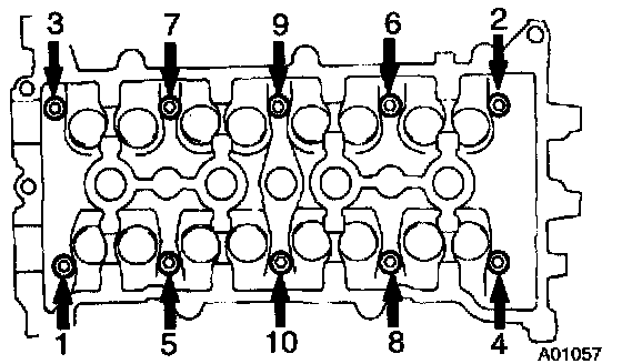 b. Using a 10 mm bi-hexagon wrench, uniformly loosen and remove the 10 cylinder head bolts in several passes, in the sequence shown.