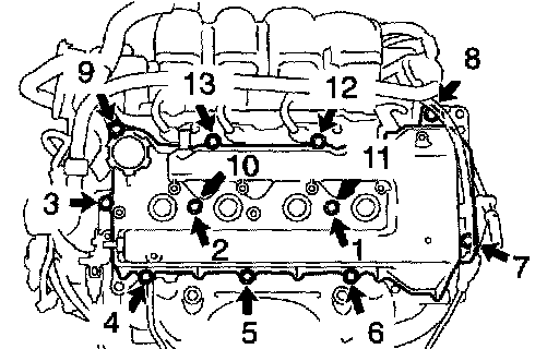 d. Install the cylinder head cover and engine wire bracket with the 9 bolts, 2 seal washers and 2 nuts. Uniformly tighten the bolts and nuts in the several passes, in the sequence shown.
