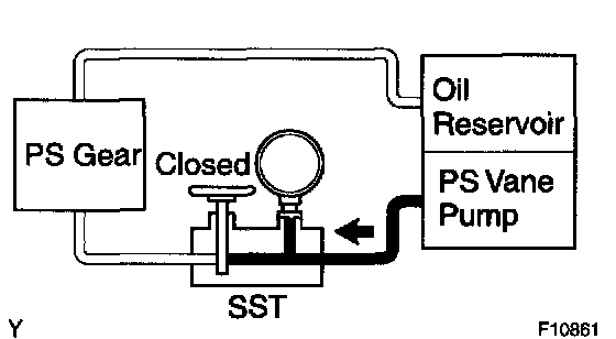 f. With the engine idling, close the valve of the SST and observe the reading on the SST.