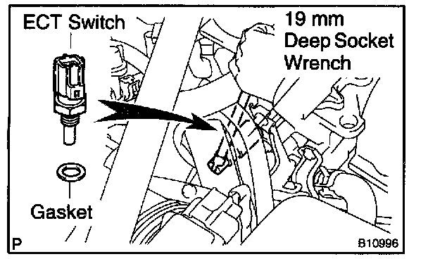 b. Using a 19 mm deep socket wrench, remove the sensor and gasket.