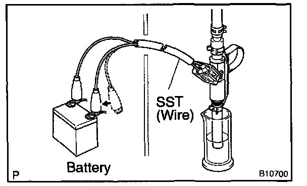 i. Connect SST (wire) to the injector and battery for 15 seconds, and measure the injection volume with a graduated cylinder. Test each injector 2 or 3 times.