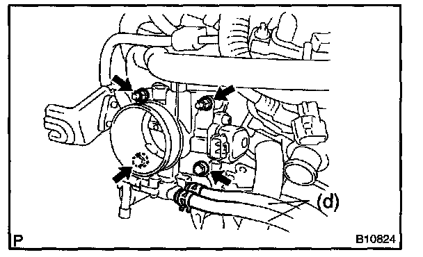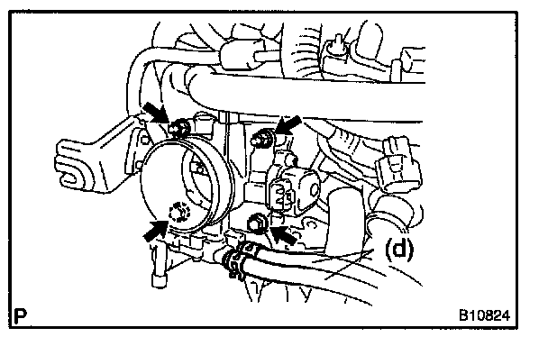 e. Remove the 2 bolts, 2 nuts, throttle body and 2 gaskets from the intake manifold.