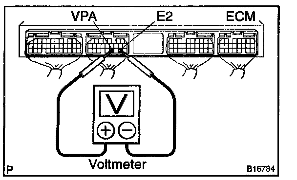 If you have no hand-held tester, measure the voltage between terminals VPA and E2 of the ECM connector.
