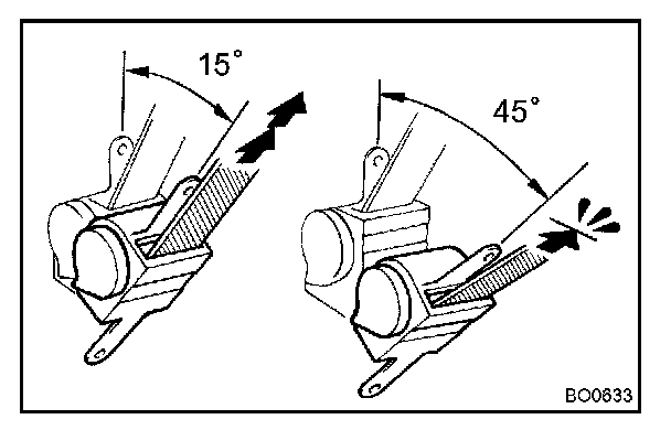 d. Make sure that the belt can be pulled out at a tilt of 15 degrees or less but cannot be pulled out at a tilt of over 45 degrees.