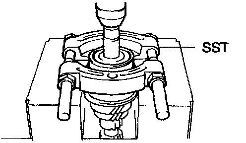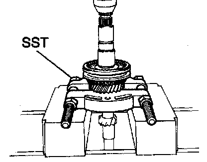 c. Using SST and a press, press out the rear radial ball bearing and 4th gear.