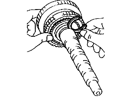 If the braking effect is insufficient, apply a small amount of the fine lapping compound between the synchronizer ring and gear cone. Lightly rub the synchronizer ring and gear cone together.