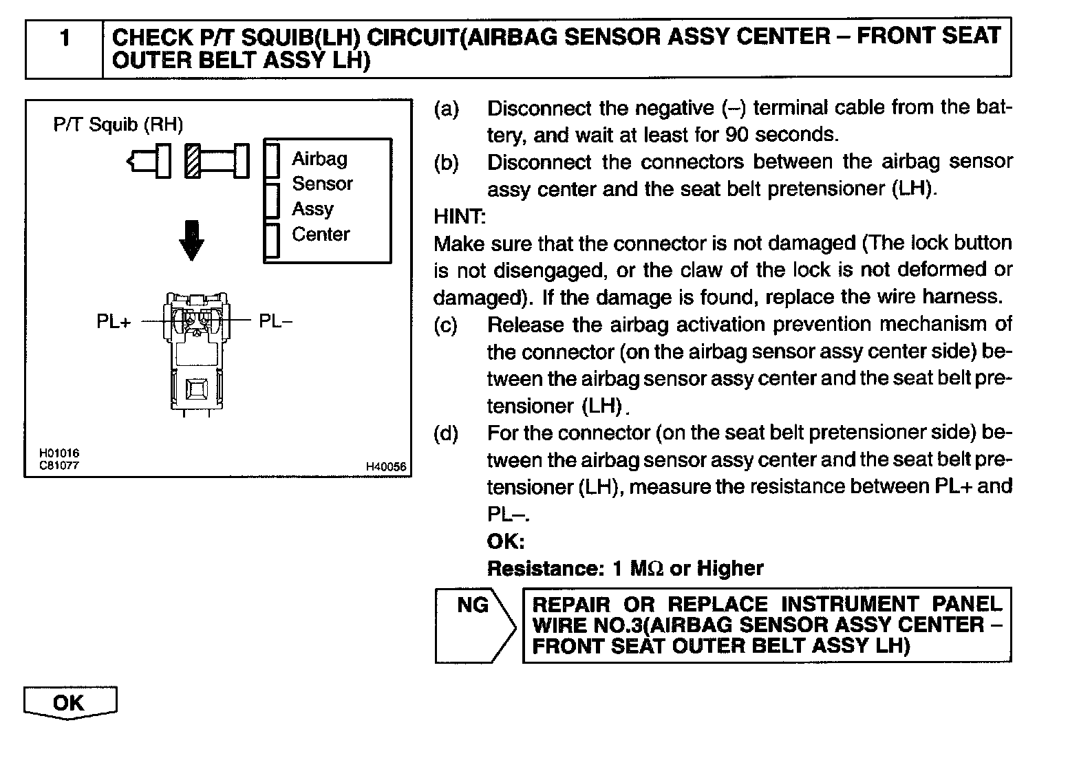 The P/T squib (LH) circuit consists of the airbag sensor assy center and seat belt pretensioner (LH).