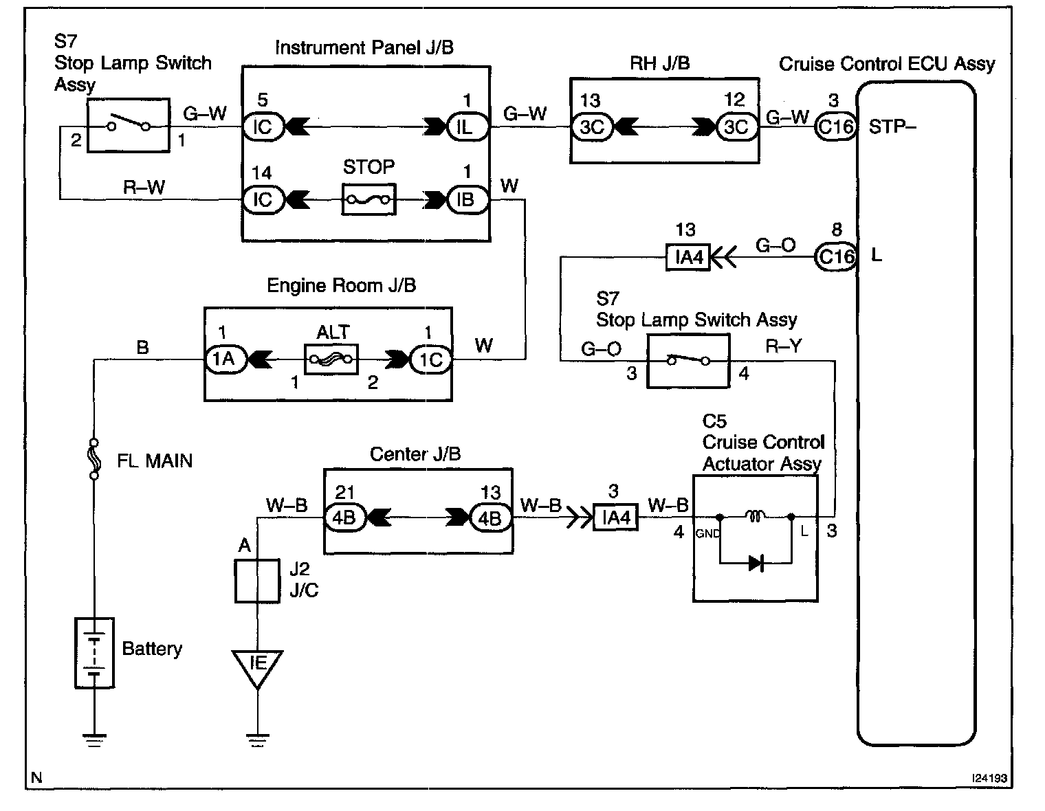 When the brake pedal is depressed, the stop lamp switch assy turns ON, supplying electrical power to the stop light. Power supply to the magnetic clutch is mechanically cut and the magnetic clutch is turned OFF. When driving downhill, if the vehicle speed exceeds the set speed by 8 km/h (5 mph), the ECU turns the safety magnet clutch OFF. If the vehicle speed later drops to within 5 km/h (3 mph) above the set speed, then cruise control at the set speed is resumed.