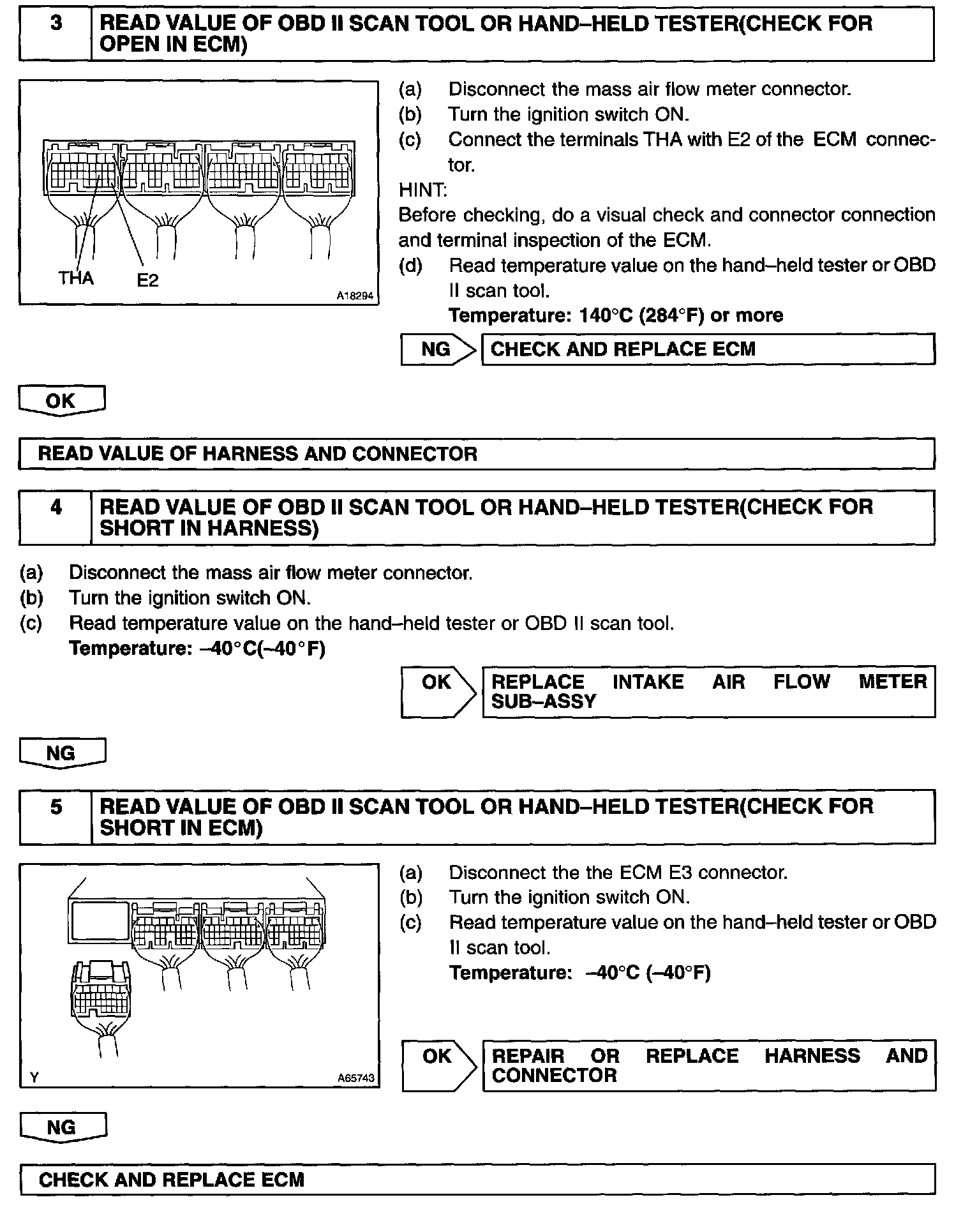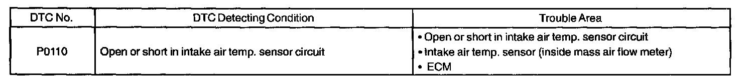 The intake air temperature sensor is connected to the ECM. The 5 V power source voltage in the ECM is applied to the intake air temperature sensor from the terminal THA via resistor R. That is, the resistor R and the intake air temperature sensor are connected in series. When the resistance value of the intake air temperature sensor changes in accordance with changes in the intake air temperature, the potential at terminal THA also changes. Based on this signal, the ECM increases the fuel injection volume to improve driveability during cold engine operation. If the ECM detects the DTC "P0110", it operates the fail safe function in which the intake air temperature is assumed to be 20 °C (68 °F).