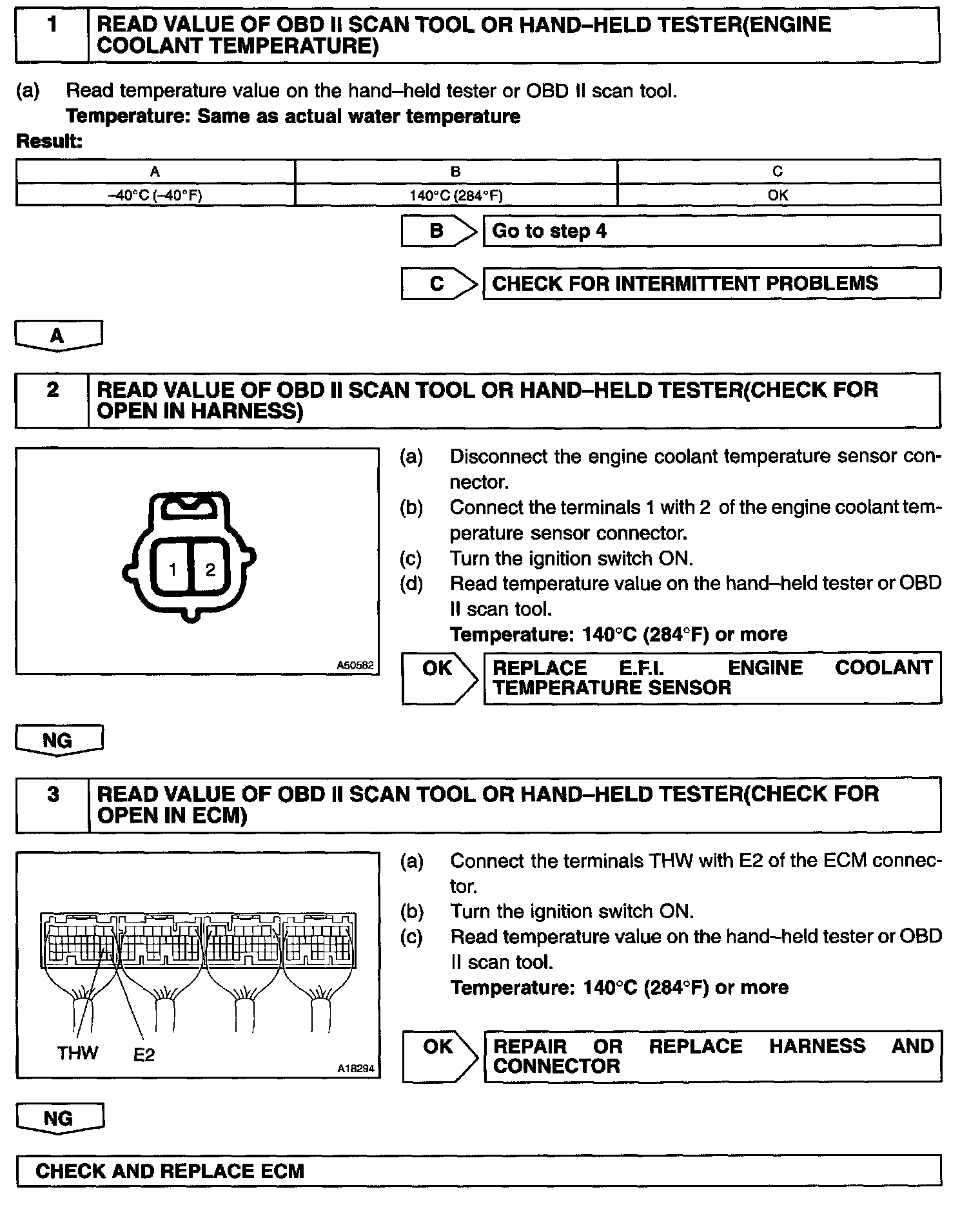 HINT: After confirming DTC P0115, use the hand-held tester or OBD II scan tool to confirm the engine coolant temperature from "CURRENT DATA".