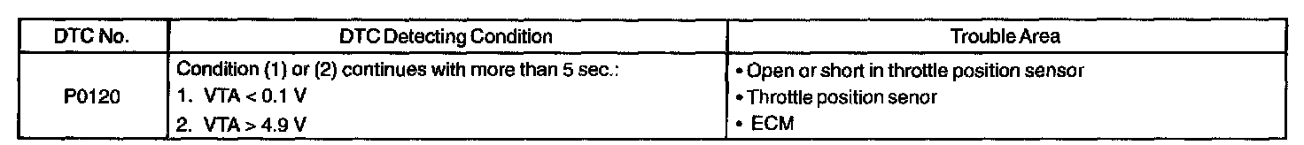 When the throttle valve is fully closed, a voltage of approximately 0.3 - 1.0 V is applied to terminal VTA of the ECM. The voltage applied to the terminals VTA of the ECM increases in proportion to the opening angle of the throttle valve and becomes approximately 3.2 - 4.9 V when the throttle valve is fully opened. The ECM judges the vehicle driving conditions from these signals input from terminal VTA, uses it as one of the conditions for deciding the air-fuel ratio correction, power increase correction and fuel-cut control etc.