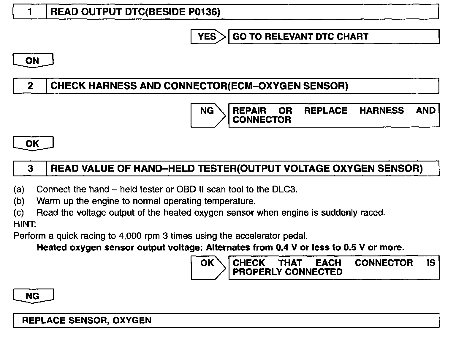 By the oxygen sensor output, the ECM can determine the deviation amount from the stoichiometric air-fuel ratio and control the proper injection time immediately. If the oxygen sensor is out of order, ECM is unable to perform the accurate air-fuel ratio control.