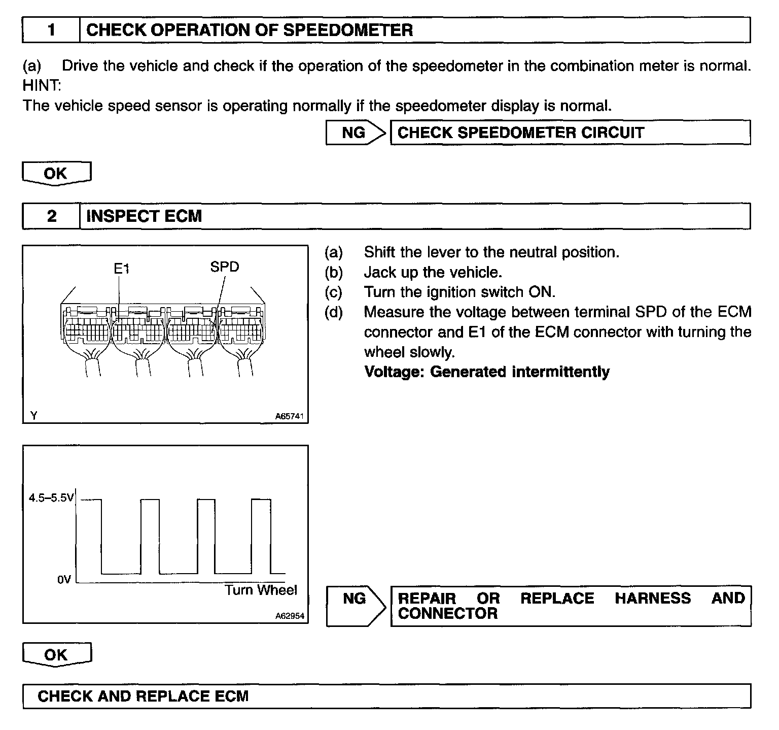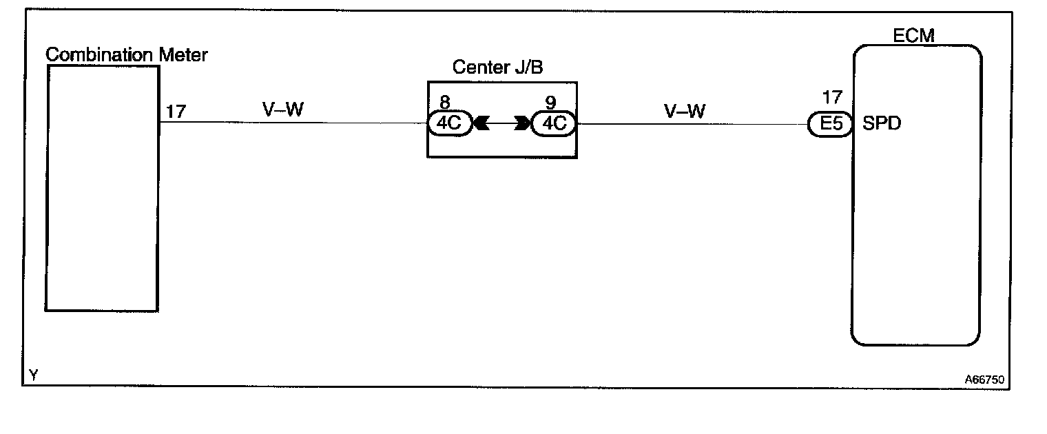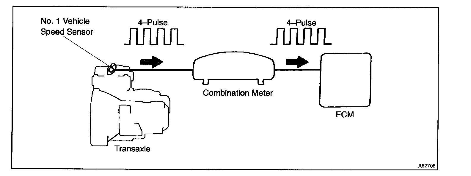 The vehicle speed sensor outputs a 4-pulse signal for every revolution of the rotor shaft, which is rotated by the transmission output shaft via the driven gear. After this signal is converted into a more precise rectangular waveform by the waveform shaping circuit inside the combination meter, it is then transmitted to the ECM. The ECM determines the vehicle speed based on the frequency of these pulse signals.