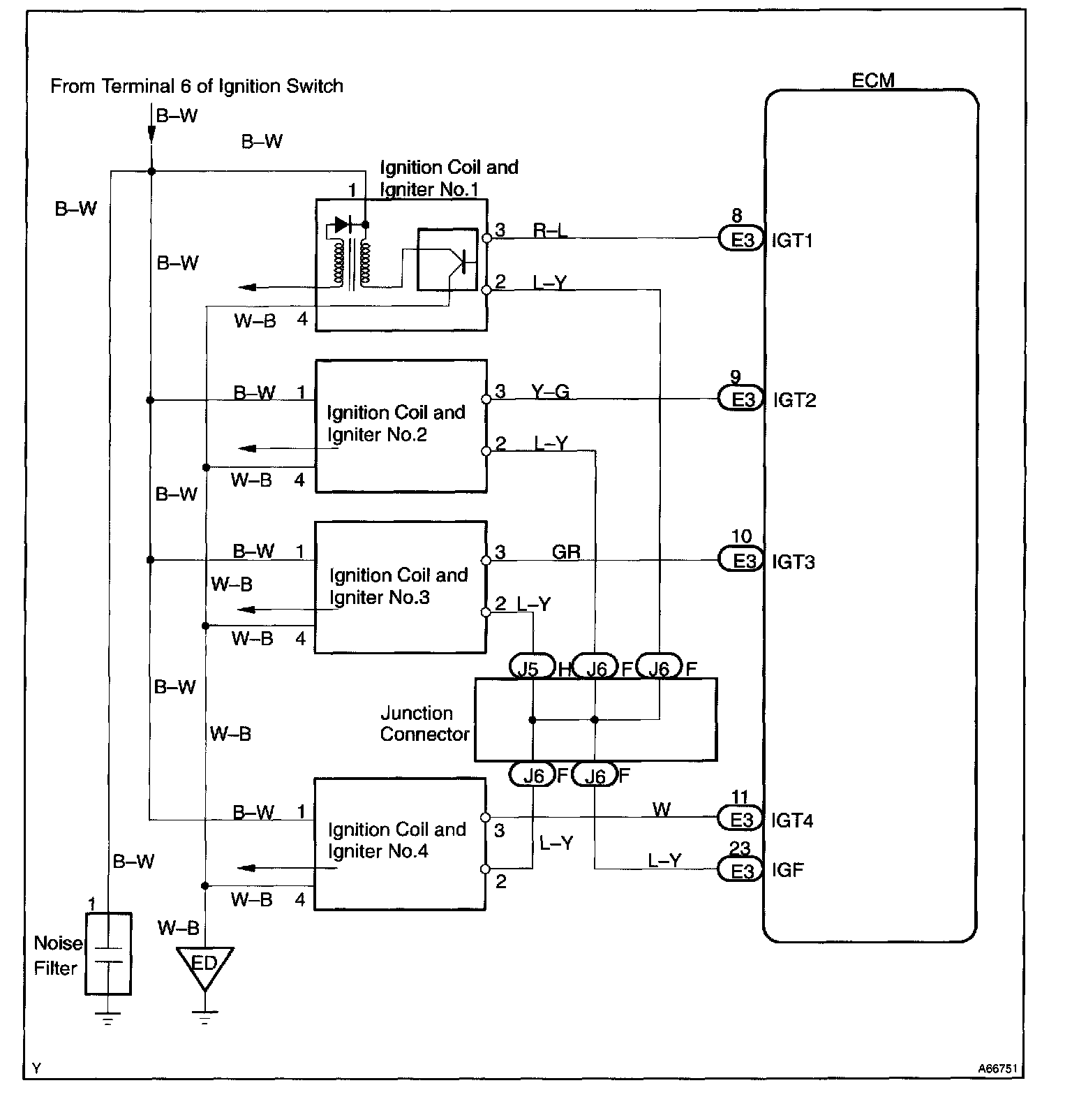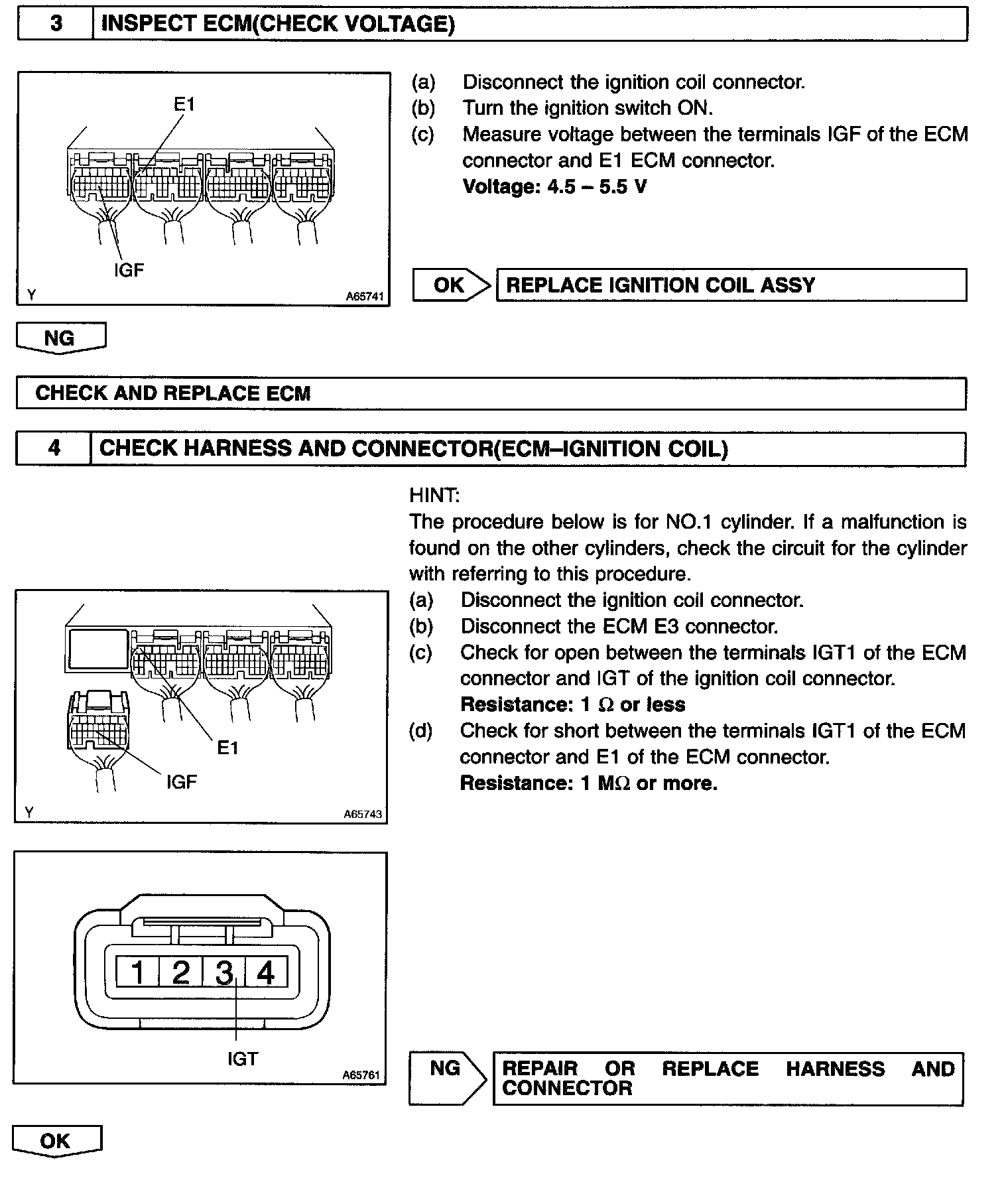 The ECM determines ignition timing and outputs the ignition signals (IGT) of each cylinder. Based on IGT signals, the power transistors cut off the current to the primary coil in the ignition coil. At the same time, the igniter also sends an ignition confirmation signal (IGF) as a fail-safe measurement to the ECM.