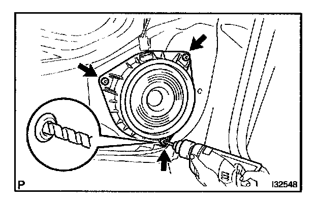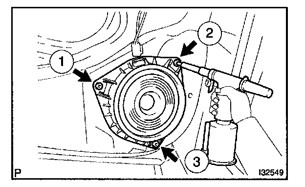 b. Using a drill of less then dia 4 mm (0.16 in.), drill out the 3 rivet heads and remove the rear speaker assy from the rear door panel.