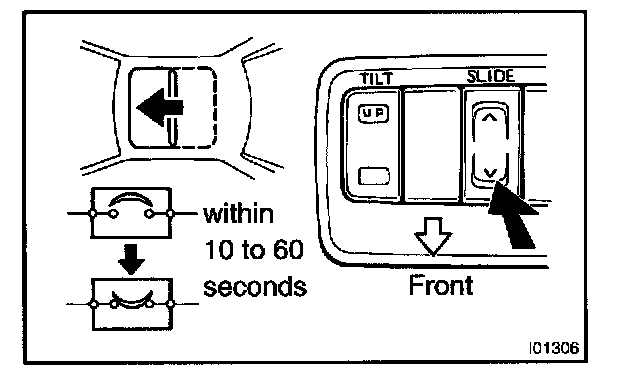 b. With the sliding roof in the fully opened position, hold the sliding roof switch in the "CLOSE" side and check that the sliding roof begins to close within 60 seconds.