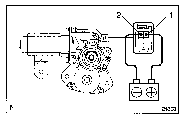 a. Connect the positive (+) lead from the battery to terminal 2 and the negative (-) lead to terminal 1, and check that the motor turns clockwise (moves to the close side).