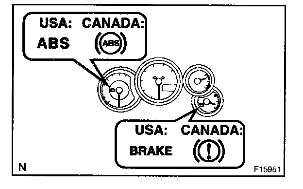 When the ignition switch is turned ON, check that the ABS warning light and brake warning light goes on for approx. 3 seconds.