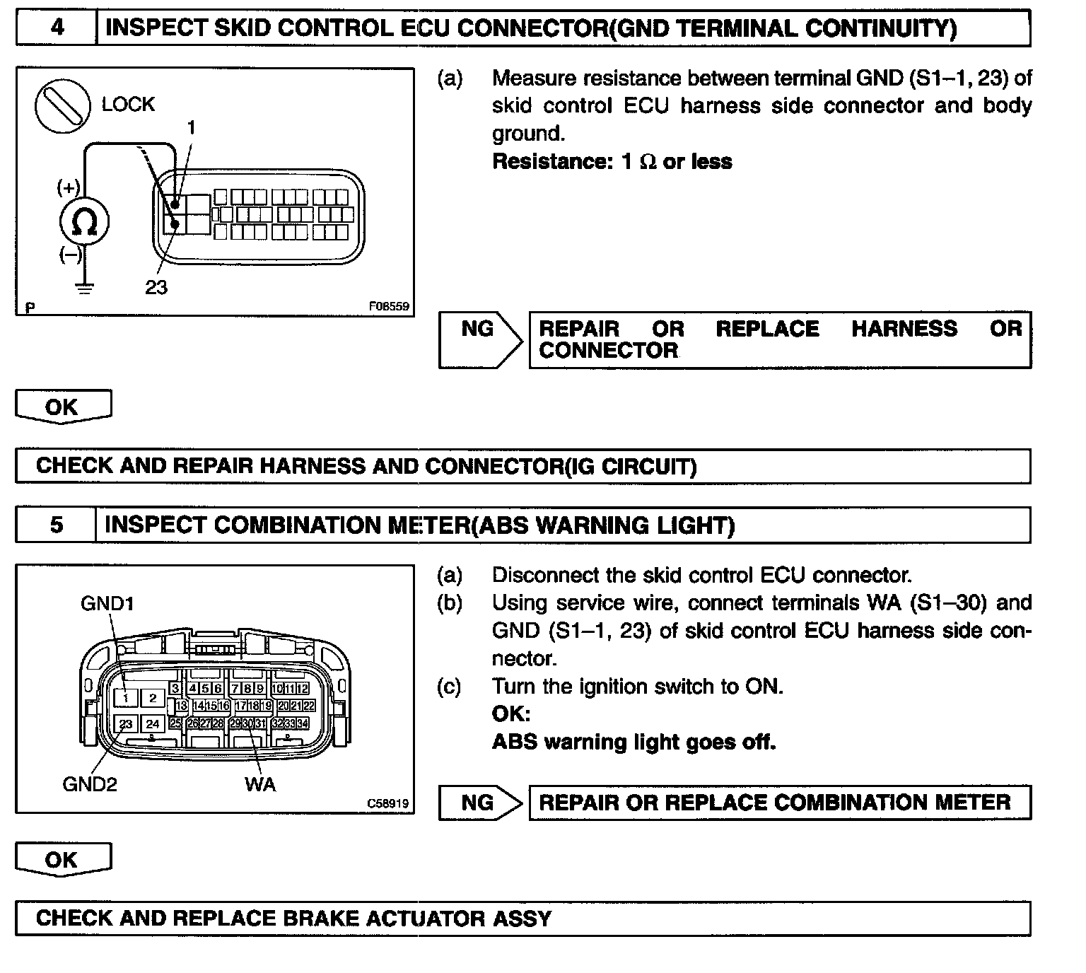 If the ECU detects trouble, it lights the ABS warning light while at the same time prohibiting ABS control. At this time, the ECU records a DTC in memory.