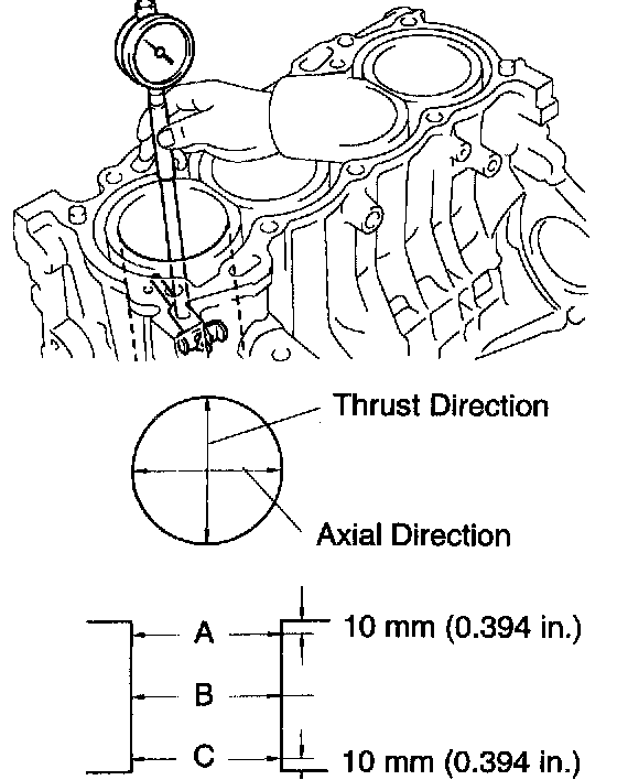 a. Using a cylinder gauge, measure the cylinder bore diameter at positions A, B and C in the thrust and axial directions.