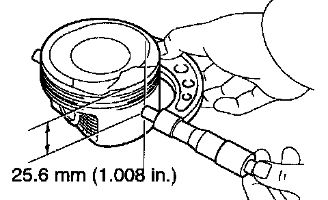 a. Using a micrometer, measure the piston diameter at a right angle to the piston pin hole, and at the piston of 25.6 mm (1.008 inch) from the piston head.