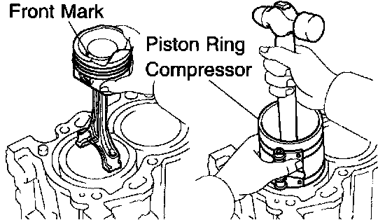 d. Using a piston ring compressor, push the correctly numbered piston and connecting rod assemblies into each cylinder with the front mark of the piston facing forward.