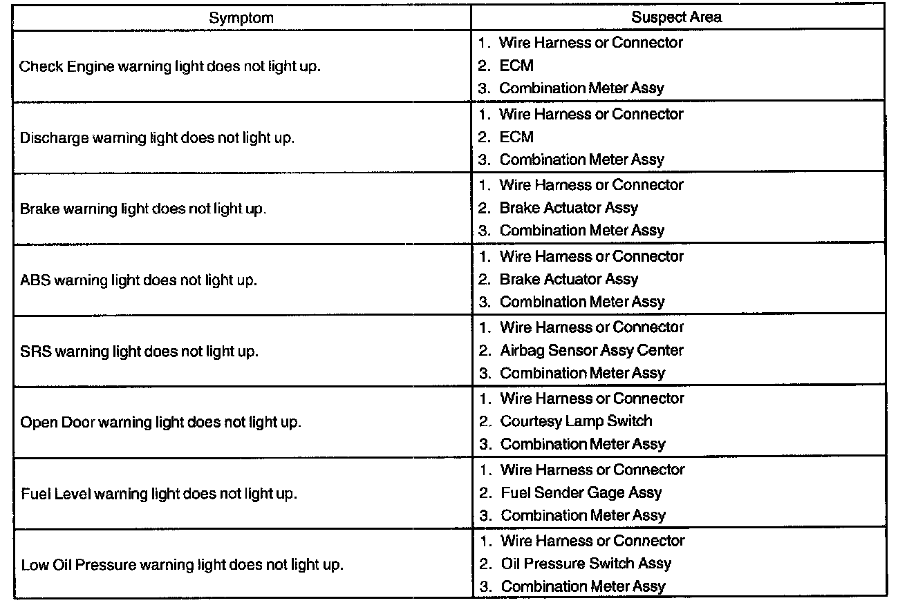 Problem Symptoms Table - Warning Lights (Combination Meter):