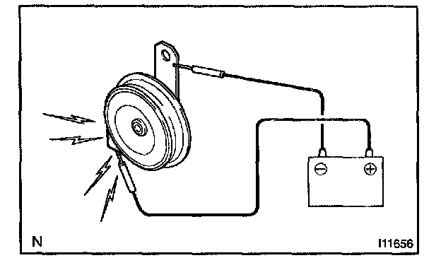 a. Connect the positive (+) lead from the battery to the terminal and the negative (-) lead to the horn body, and check that the horn blows.