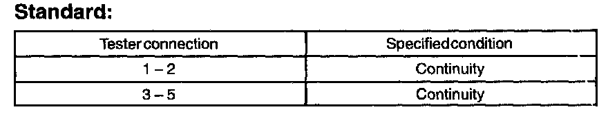 2. Apply battery voltage (10 - 14 V) between terminal 1 and 2, then check that there is continuity between terminal 3 and 5.