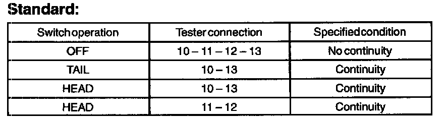 1. Check that there is continuity between terminals at each switch position as shown in the chart.