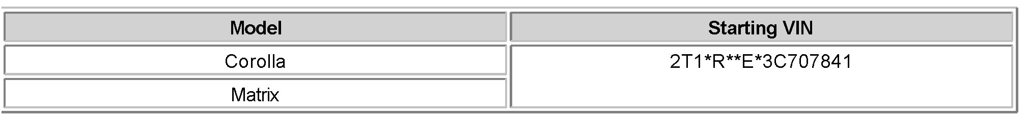 2003 model year Corolla and Matrix vehicles with 1ZZ-FE engines produced BEFORE the Production Change Effective VIN shown below.