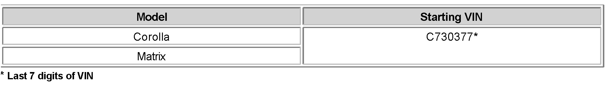 APPLICABLE VEHICLES: 2003 model year Corolla and Matrix produced BEFORE the VIN shown below.