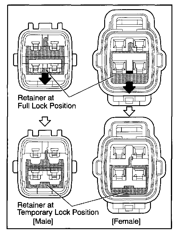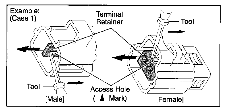 Insert the special tool into the terminal retainer access hole ([] Mark) and pull the terminal retainer up to the temporary lock position.