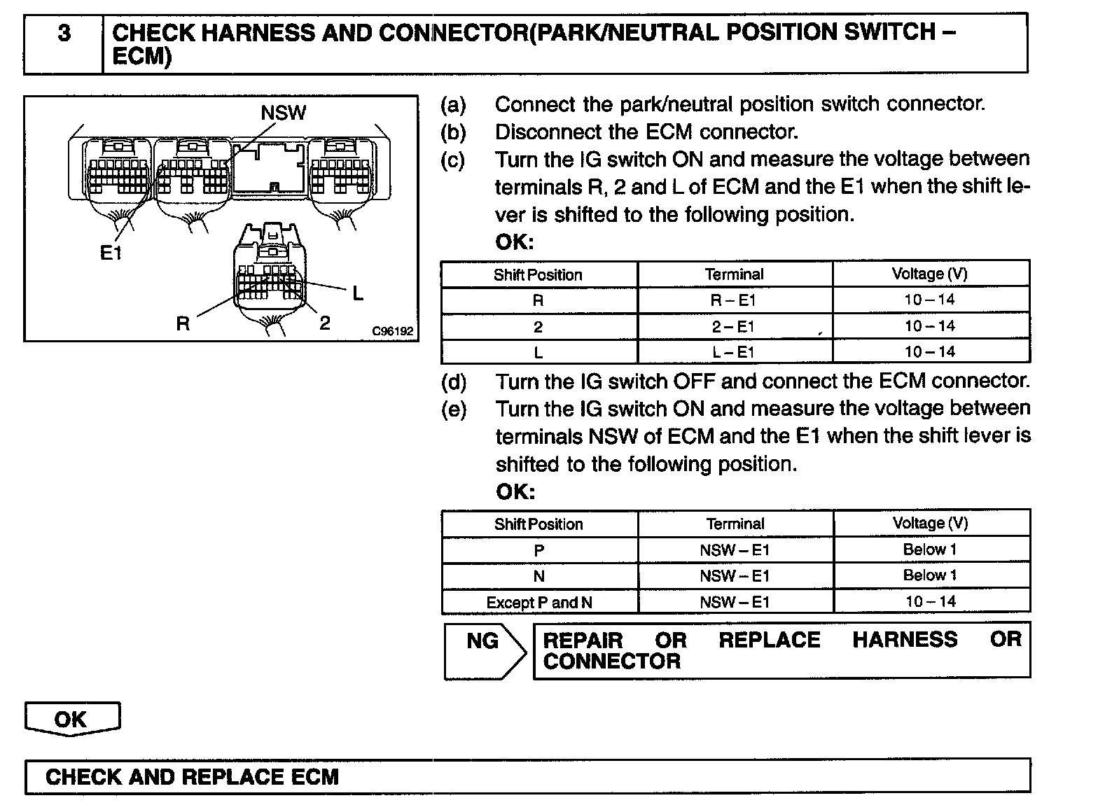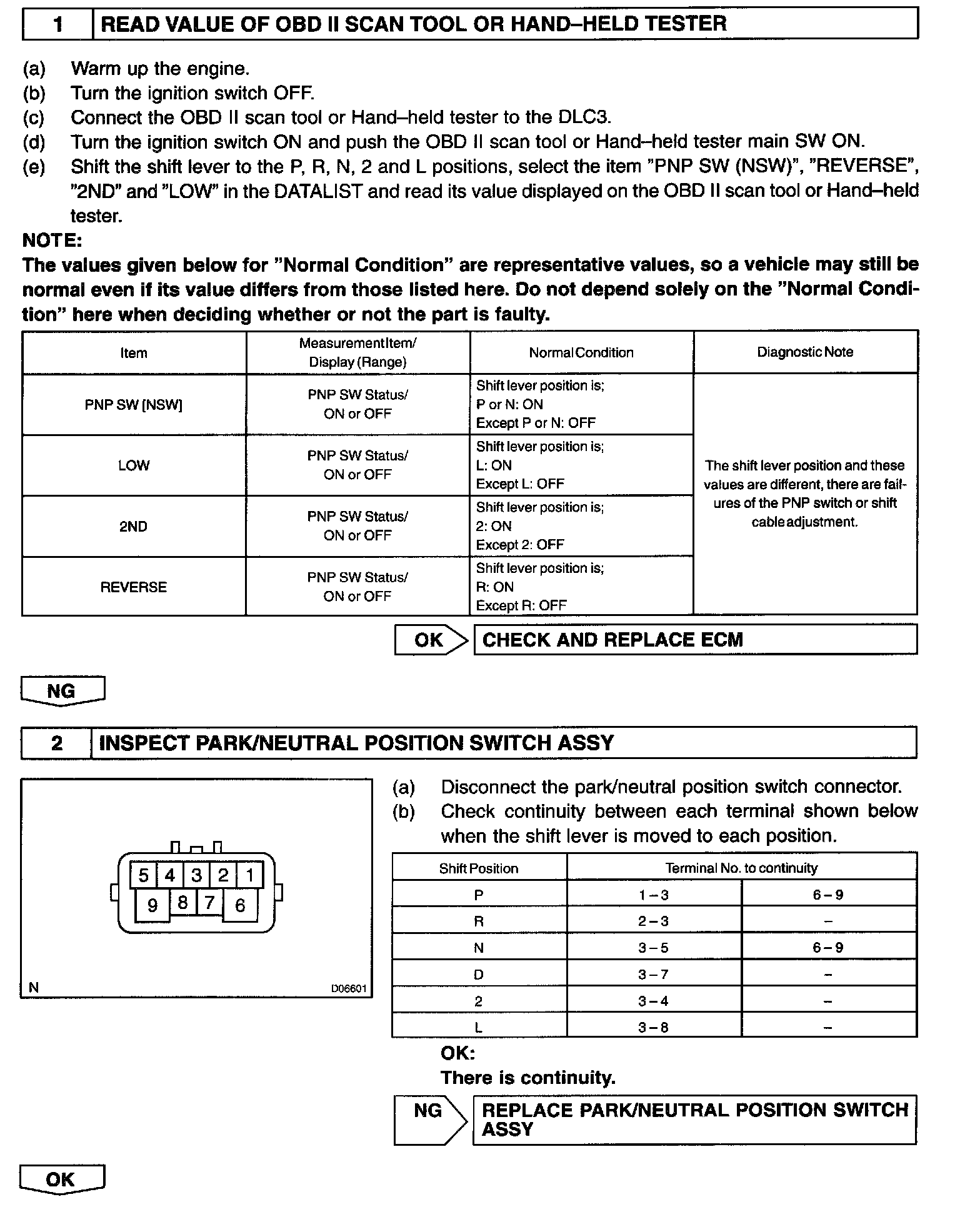 The park/neutral position switch detects the shift lever position and sends the signals to the ECM. The ECM receives the signals (NSW, R, 2 and L) from the park/neutral position switch when the signal is not sent to the ECM from the park/neutral position switch, the ECM judges that the shift lever is in the D position.