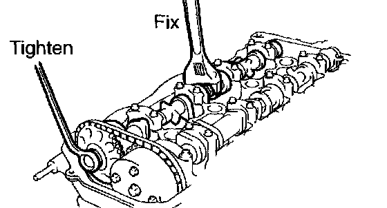 d. Fix the camshaft with a spanner and so on, then loosen the camshaft timing gear set bolt.