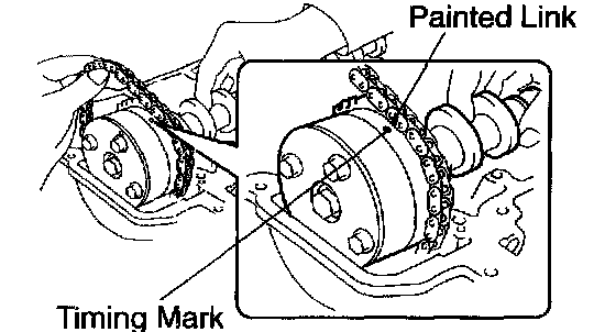 m. As shown in the illustration, install the timing chain on the camshaft timing gear, with the painted links aligned with the timing marks on the camshaft timing sprocket.