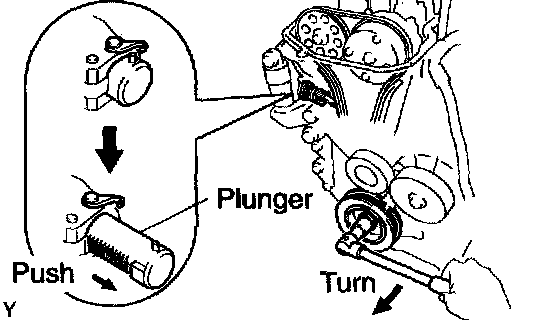 HINT: If the plunger does not spring out, press the slipper into the chain tensioner with a screwdriver so that the hook is released from the knock pin and the plunger springs out.