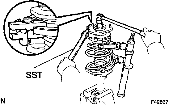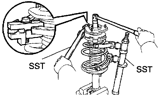 c. Using SST to hold the front coil spring seat upper LH, remove the nut.