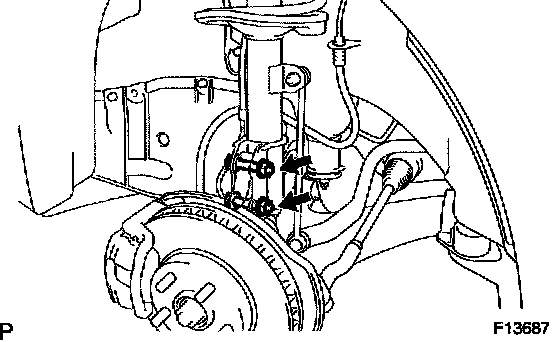 c. Install the 2 bolts and nuts to the lower side of front shock absorber with coil spring.