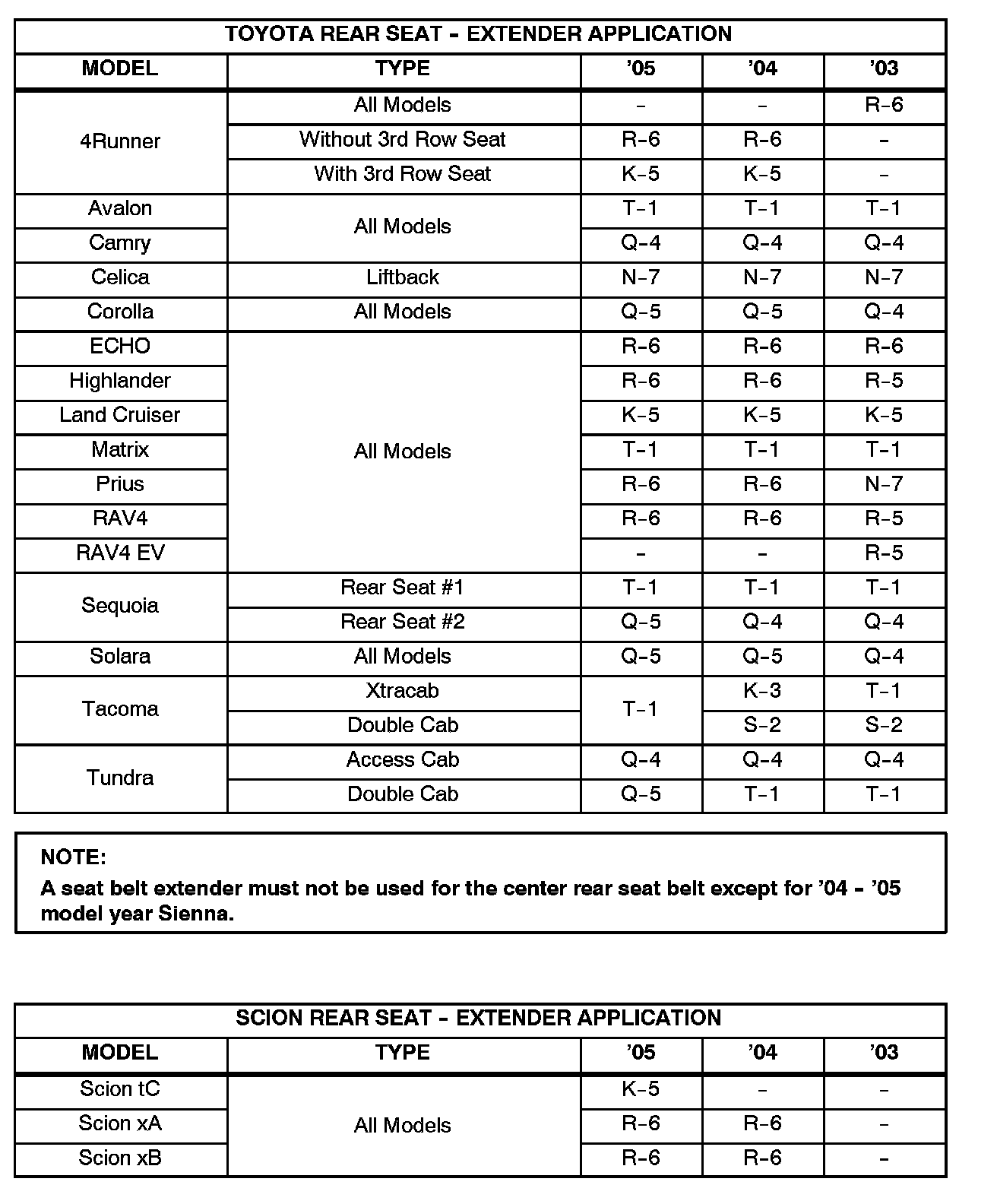 ^ December 9, 2005: Series QSS has been updated to R-7. In the "Rear Seat Belt Extender Applications" section, series Q-4 for the 2005 model year Sequoia and Tundra has been updated to Q-5, and the Tundra D-Cab has been added.