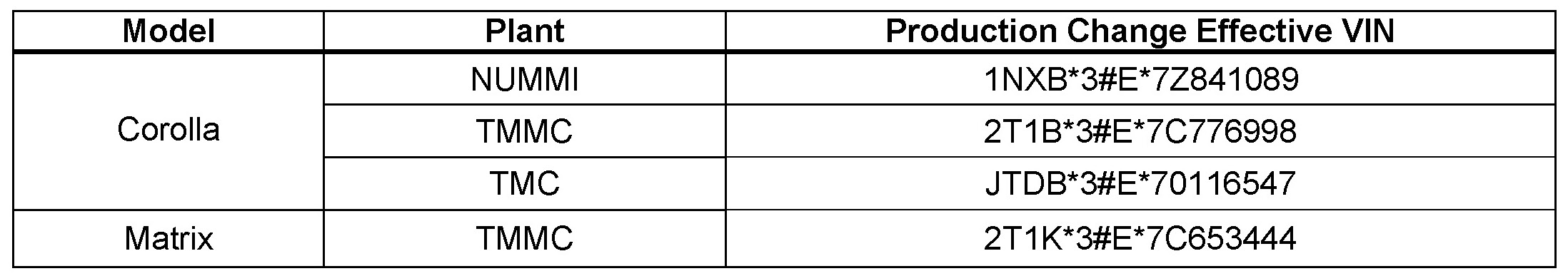 - 2003 - 2007 model year Corolla and Matrix vehicles produced BEFORE the Production Change Effective VINs shown below.