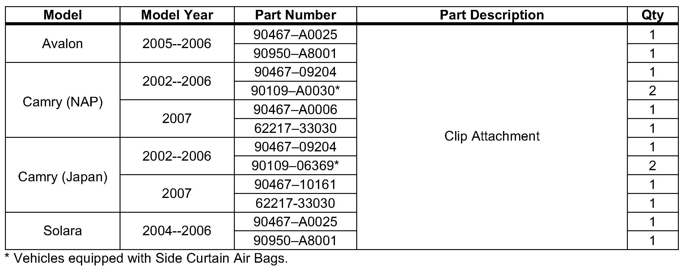 - February 21, 2007: In the Parts Information table, the clip numbers for 2007 model year Camry vehicles have been updated.