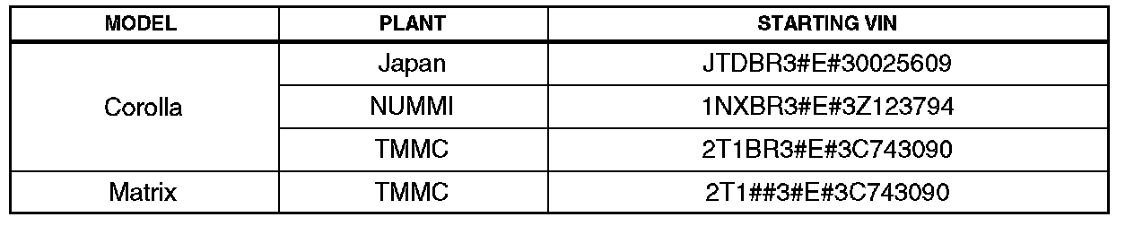 ^ 2003 model year Corolla and Matrix vehicles produced before the VINs shown below.