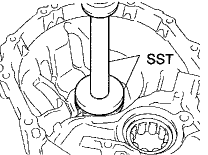 b. Using SST and a press, install a new FR differential case front tapered roller bearing (outer race) with shim to the transaxle case.