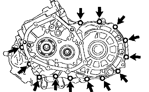 e. Remove the 16 bolts and manual transmission case from the transaxle case.