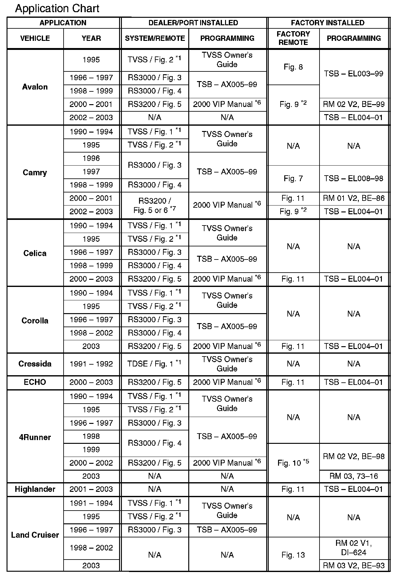 The table contains all of the necessary information to correctly identify the type of system installed, and where to go to get programming procedures for each vehicle.